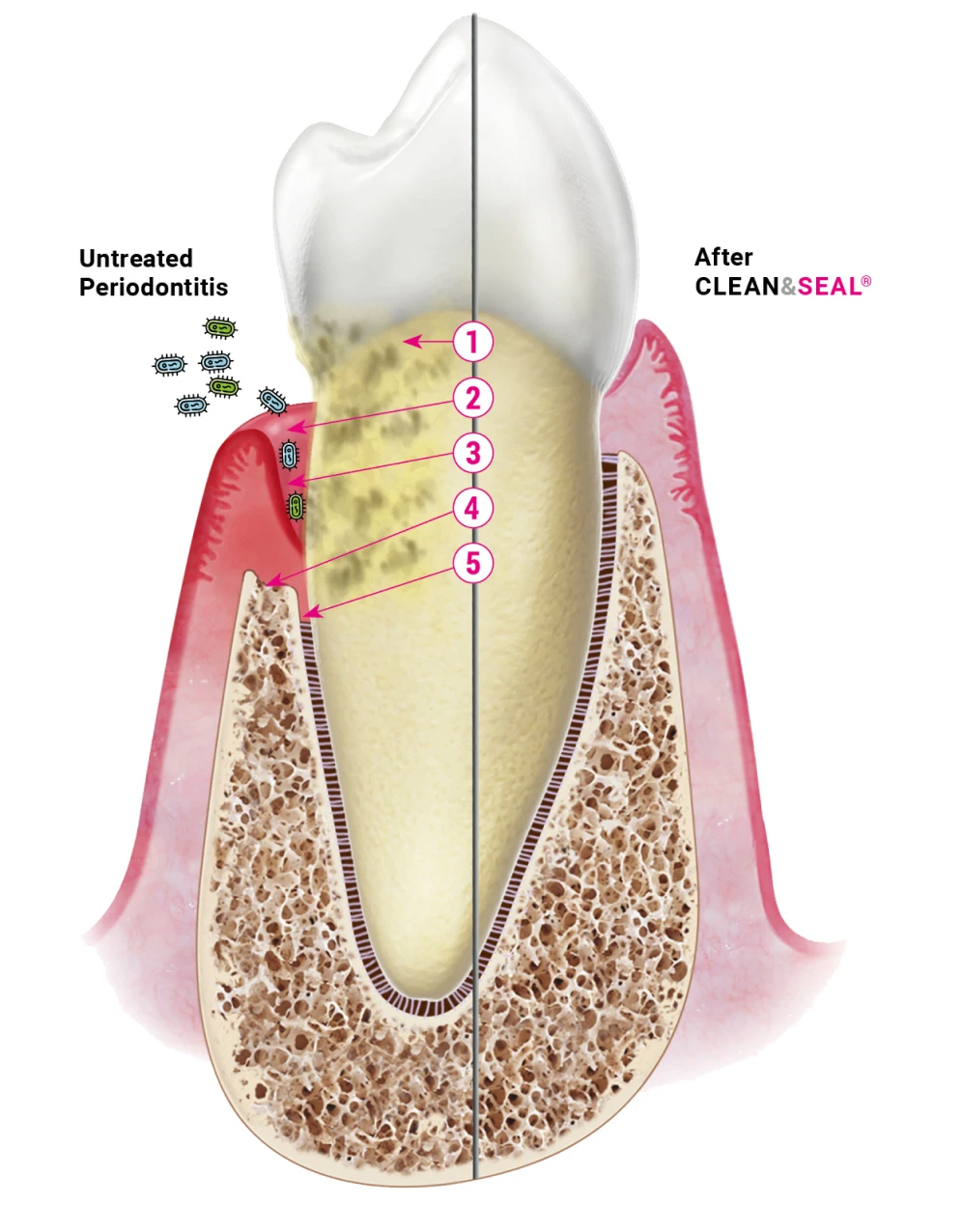 Bij ernstige tandvleesontstekingen (parodontitis) of peri-implantitis (ontsteking rond een implantaat) bestaat CLEAN&SEAL uit twee stappen: eerst wordt er gereinigd, daarna wordt het gebied afgesloten met een beschermende gel. Uit ervaring en onderzoek blijkt dat deze volgorde van reinigen en verzegelen unieke resultaten oplevert: het lichaam krijgt de kans om het weefsel rond tanden of implantaten te herstellen, zonder dat een operatie nodig is.